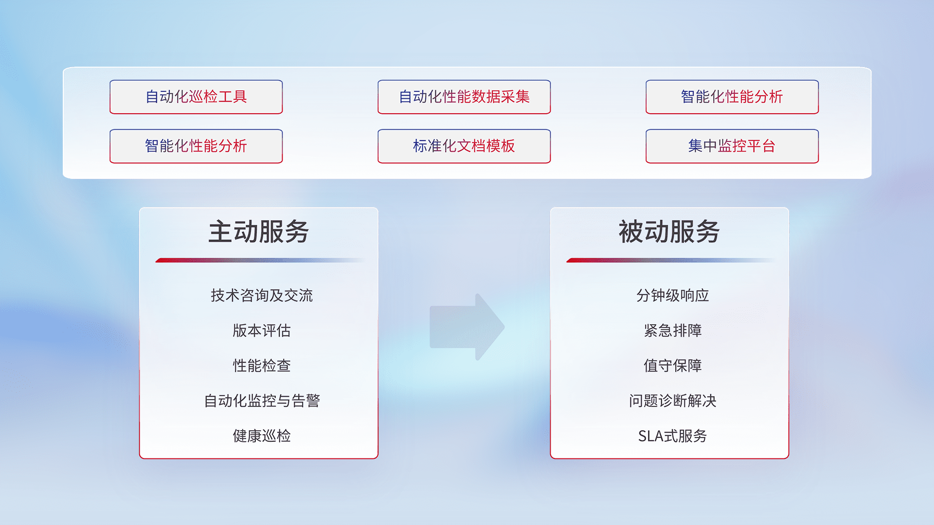 智能化工具和标准化文档,,,保障服务质量,,,提供主动服务(包含技术咨询、、、、版本评估、、、、性能检查、、、、自动化监控与告警、、、、健康巡检)和被动服务包含(分钟级响应、、、紧急排障、、值守保障、、、问题诊断解决、、、、SLA服务)。。