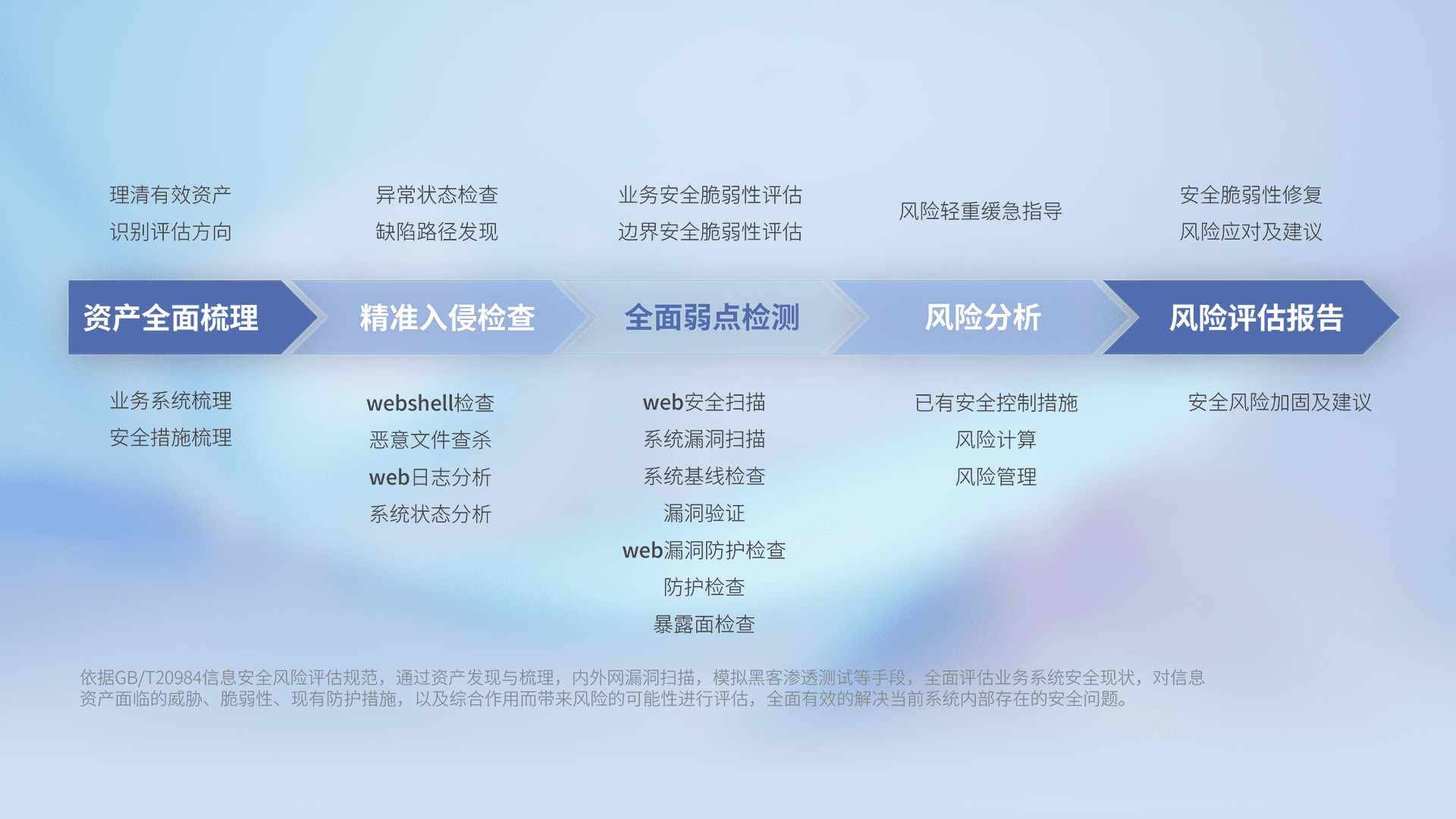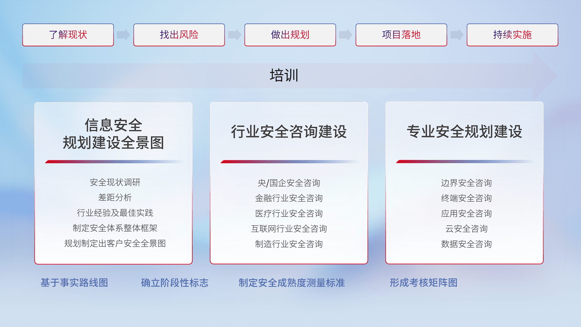 针对客户行业特性,,,以专业的安全服务+多厂商联合解决方案提供专属的一站式安全管理服务,,,,帮助客户全面感知网络空间威胁,,,,基于识别、、、检测、、、分析、、、、防护、、监测、、响应的服务理论模型,,从方案咨询、、、集成交付、、、评估验证、、、优化加固、、运维运营,,致力于为客户提供完整的闭环管理式安全服务。。。。以实战经验为客户打造高抵御风险的安全体系,,帮助客户发现威胁、、、、对抗威胁、、、处置威胁,,不断积累安全对抗能力,,,,持续保障数字化安全。。。
